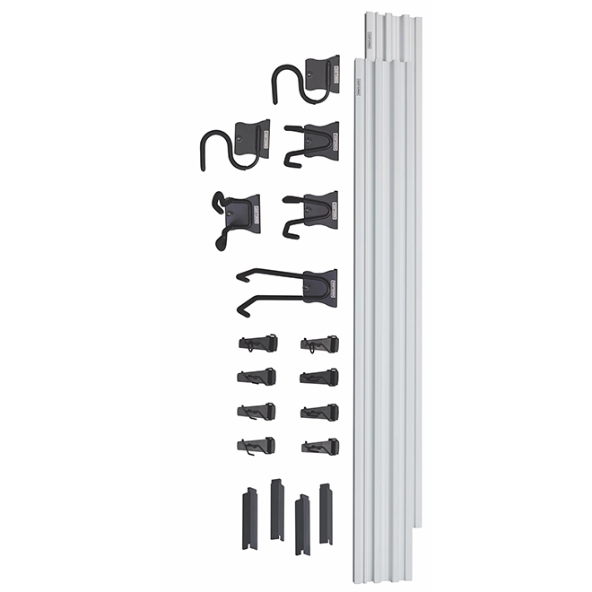 Includes two Versatrack rails, four end caps, two short general-purpose hooks, two curved pivot hooks, one long general-purpose hook, one outdoor power equipment hook and eight snap-in hooks. Trackwall can be installed as individual strips or can support pegboard, grooves in track hold pegboard away from wall. Six large hooks include patented Hooktite latching system that holds hooks on the track wall rails and prevents hooks from popping off the rail. End caps create a finished look. Can be installed on drywall, wall studs, or masonry. Supports up to 75 lbs.per linear foot. Installation requires screws and a drill. 1-year limited manufacturer’s warranty.