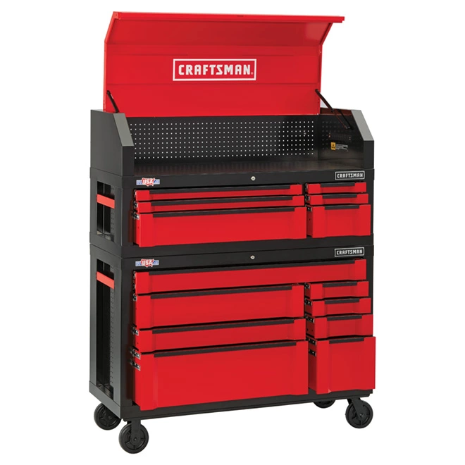This Craftsman® chest is made with quality materials that strengthen the design. The soft-close drawers gently pull themselves closed and will not slam shut. This helps keep your tools in place and ensures your drawers stay closed. Each heavy-duty drawer can support 120 lb. and glides smoothly on ball-bearing slides. A deep storage area under the lid includes a pegboard area to organize your tools as well as a power strip with six outlets and two USB ports, making it the ideal place to store and charge your power tools and electronics. 18- gauge extra deep I-Frame® construction holds up to heavy use. Gas struts support the tool chest lid and provide access to the charging area. Keyed internal locking system safeguards your tools. Craftsman® embossed non-slip drawer liners help hold tools in place and a Craftsman® embossed top mat protects surface under the chest lid. Recessed full-grip side handles help move storage around your shop. The chest offers 16,739 cubic inches of storage. The overall dimensions: 54.7″ wide x 22.2″ deep x 27.7″ high. This product is backed by a 10-year limited manufacturer’s warranty. (Combine this item with Craftsman® tool cabinet # CMST25480RB sku: 16765017 see image).