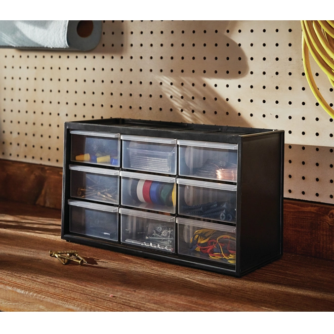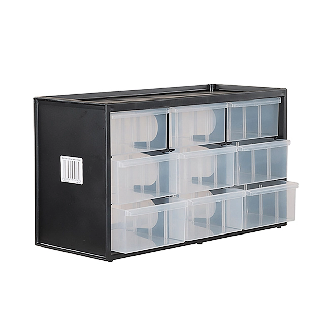 The Craftsman® bin system comports (9) large drawers that facilitate the organization of small parts. The housing is made of durable polypropylene, while the transparent drawers provide good visibility to content. It can be mounted and stacked one on the other to form a full, modular storage system. This product is backed by a 1-year limited warranty.