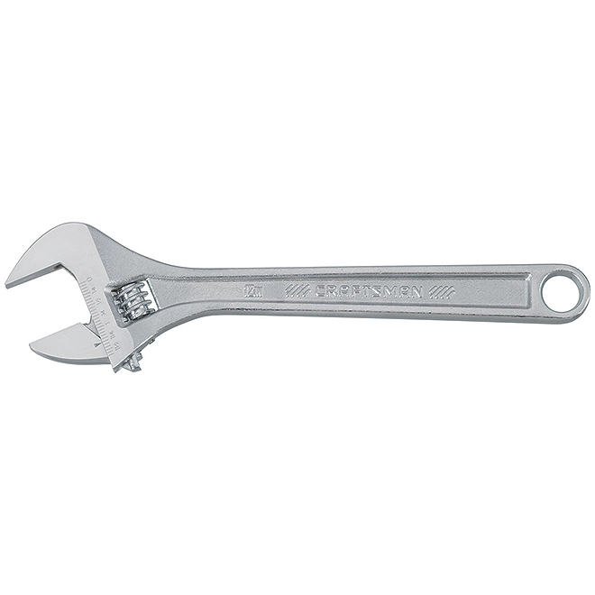 The 12” (30.48 cm) Craftsman® adjustable wrench boasts an all steel construction with a chrome finish fully polished ensuring corrosion resistance. It is equipped with a wide opening jaw for added versatility. A metric and SAE scale is engraved for easy gauging of work piece size. The wrench meets or exceeds ASME specifications. This product is backed by a lifetime warranty.