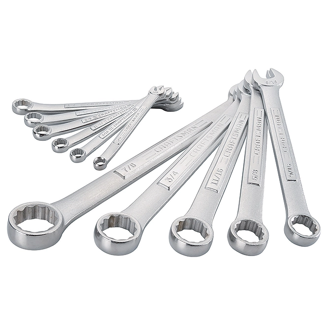 This combination wrench set by Craftsman® features a polished full chrome finish for corrosion resistance and large markings to help you quickly identify the sizes you are looking for. Also, the 12-point socket design allows for quick engagement with fasteners, ideal for lightweight jobs, while the 15° box end offset offers additional knuckle clearance. These meet or exceed ASME specifications. Set includes 11 combination wrenches: 1/4″, 5/16″, 11/32″, 3/8″, 7/16″, 1/2″, 9/16″, 5/8″, 11/16″, 3/4″, and 7/8″. This product is backed by the Craftsman® full lifetime warranty.