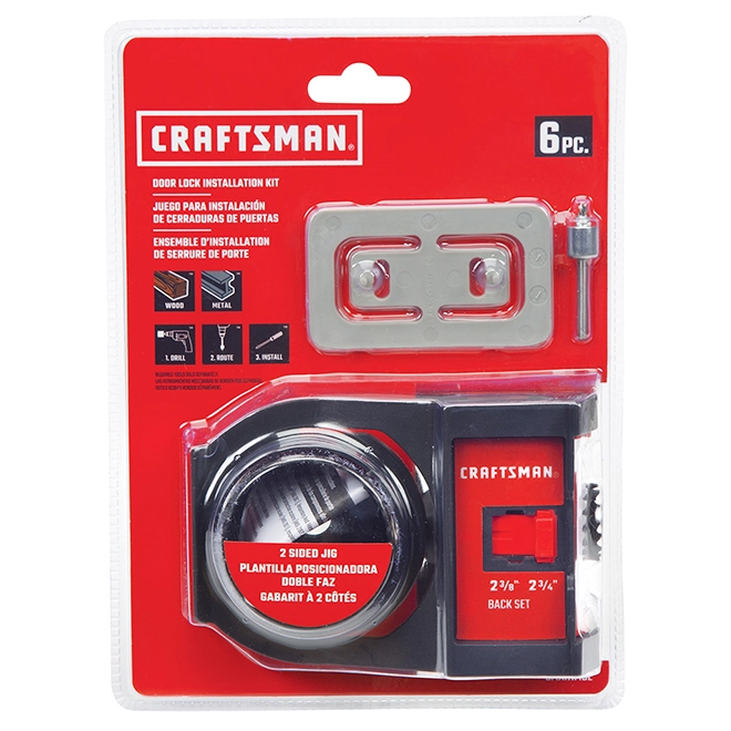 Use the Craftsman door lock installation kit to install a lockset on any metal or wooden door. This kit has a self-centring jig, so it can fit all common door widths. The bi-metal door lock installation kit is adjustable for both 2 3/8 in and 2 3/4 in backseats. Buy these in a pack of 6 units.