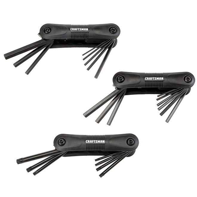 Manual jobs will be greatly simplified with these 3 packs of Craftsman hex keys. Each package has rubber side sections for a secure grip during tightening. Made of durable composite, the 25 folding hex keys feature a beveled edge which helps guide the wrench for a smooth, easy entry into the hex key. This set can be used for carpentry, electrical, mechanical and plumbing applications, DIY projects or machinery maintenance and upkeep. Finally, this set includes SAE and metric star-shaped keys.