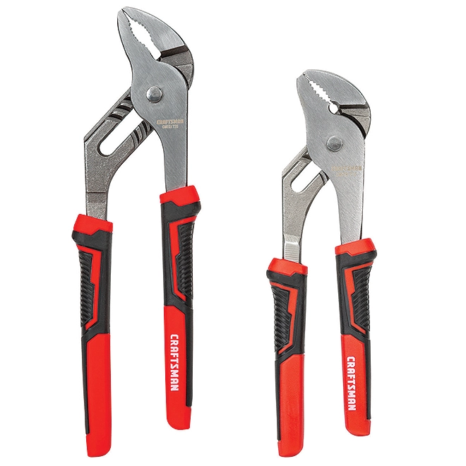 The Craftsman® groove joint pliers are ideal for grasping and turning thanks to their slip-resistant tongue and precision machined jaws. Its drop-forged steel construction and multi-zone bimaterial grips provide comfort and control. The set includes (1) 8” pliers and (1) 10”.