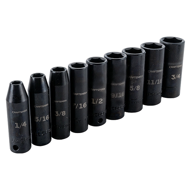 This socket set by Craftsman® features a black oxide finish for corrosion resistance and large markings to help you quickly identify the sockets you are looking for. Also, the 6-point socket design allows for increased torque due to a larger contact surface. Sockets meet or exceed ASME specifications. This set includes 9 deep sockets: 1/4″, 5/16″, 3/8″, 7/16″, 1/2″, 9/16″, 5/8″, 11/16″, and 3/4″. This product is backed by the Craftsman® full lifetime warranty.