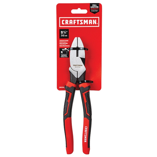 This pair of lineman’s pliers by Craftsman® features multizone bi-material grips for more comfort and control. Its induction-hardened cutting edges stay sharper longer and its drop-forged steel construction confers more strength and durability. These pliers also have a corrosion-resistant finish.