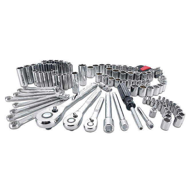 This mechanic-style set features 135 SAE and metric 1/4″ – 3/8″ parts for all your household and automotive needs. Each socket has large markings for a quick size identification. The 72-tooth ratchet offers minimal arc swing when fastening, while the hex sockets offer increased torque with the fastener. Sockets are covered with a fully polished chrome finish for superior corrosion resistance. Furthermore, a compact and molded storage case makes it easy to transport tools and gives them an exceptional durability. In addition to ratchet drivers, this kit includes 19 shallow 1/4″ sockets, a 1/4″ x 3″ driver extension bar, a 1/4″ bit driver, 12 deep 1/4″ sockets, 21 shallow 3/8″ sockets and 14 deep 3/8″ sockets. This set comes with Craftsman’s full lifetime warranty.