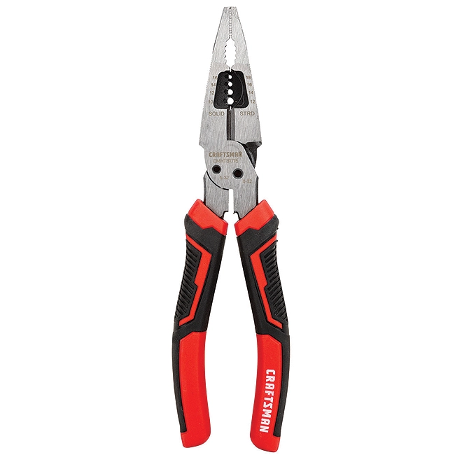 This Craftsman® 6-in-1 multifunction tool contains 1 pair of long nose pliers, 1 wire stripper, 1 reamer, 1 bolt cutter and 1 spanner. Its multi-zone bi-material grips allow more comfort and control. Its induction-hardened cutting edges stay sharper longer and its drop-forged steel construction confers more strength and durability. This tool is perfect for common applications