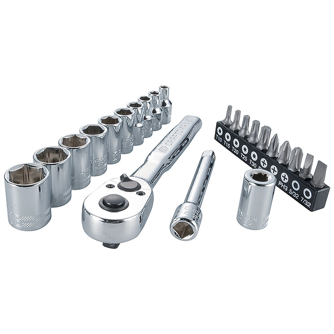 This mechanic-style set features 24 metric 1/4″ nano parts for all your household and automotive needs. Each socket has large markings for a quick size identification. The 72-tooth ratchet offers minimal arc swing when fastening, while the hex sockets offer increased torque with the fastener. The key and sockets are covered with a fully polished chrome finish for superior corrosion resistance. Moreover, a compact storage case makes it easy to transport tools and gives them an exceptional durability. In addition to the ratchet driver, the kit includes SAE 1/4″ shallow sockets (4, 5, 6, 7, 8, 9, 10, 11, 12, 13 mm), a 1/4″x 6″ driver extension bar, a 1/4″ driver bit adapter and 11 specialty bits (star-shape, crosstip, hex). This set comes with Craftsman’s full lifetime warranty.