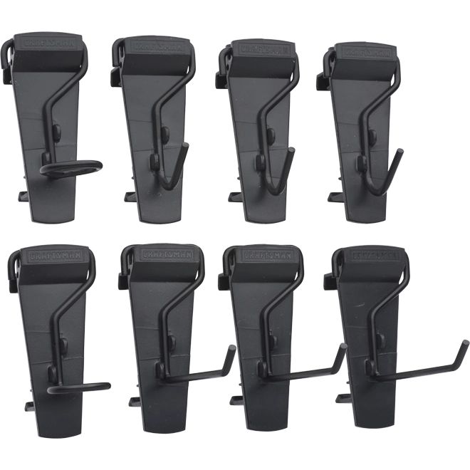The Craftsman® hooks mounts the VersaTrack rail to create a flexible and convenient storage system. It includes a variety of 8 small hooks to store hand tools or lightweight items. The hooks snap into VersaTrack rail without tools or hardware. Each hook supports 2 – 5 lb. This product is backed by a 1-year limited warranty.